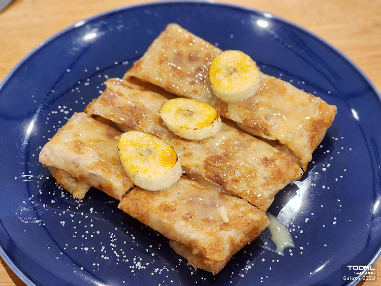 Pan-seared Butter Roti, Bananas topped with Condensed Milk and Sugar