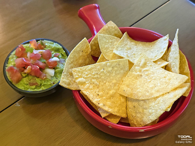 또르띠야 칩, 과꽈몰레(아보카도 1개, 토마토, 양파, 고추, 레몬즙을 섞어 만든 아보카도 디핑 메뉴)